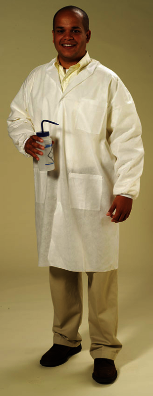 Spunbond polypropylene is a lightweight, breathable fabric that keeps workers cool while offering protection from light splash and particulates. Elastic wrists with neck- and waist-ties for the wraparound styling.