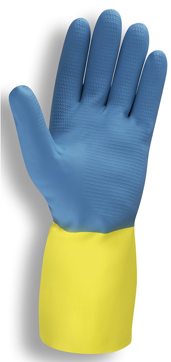 Unique dipping process which combines neoprene over natural rubber latex provides increased protection against a wide range of chemicals. Abrasion and puncture resistance. Excellent wet/dry gripping with recessed diamond embossed pattern on palm. Specifications: 27mil, 13" length, flock lining, recessed diamond embossed pattern on palm.