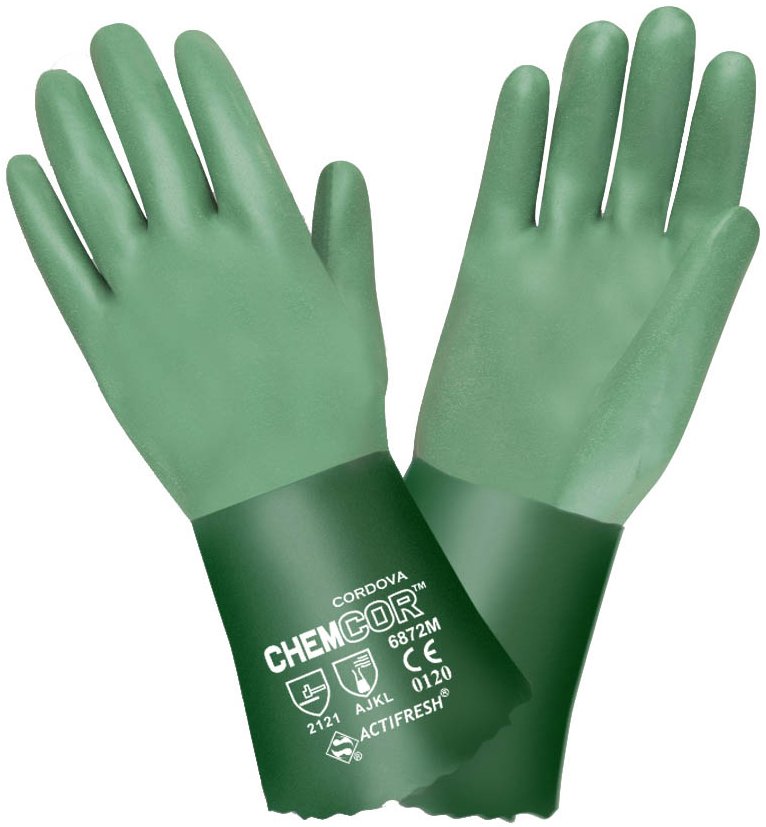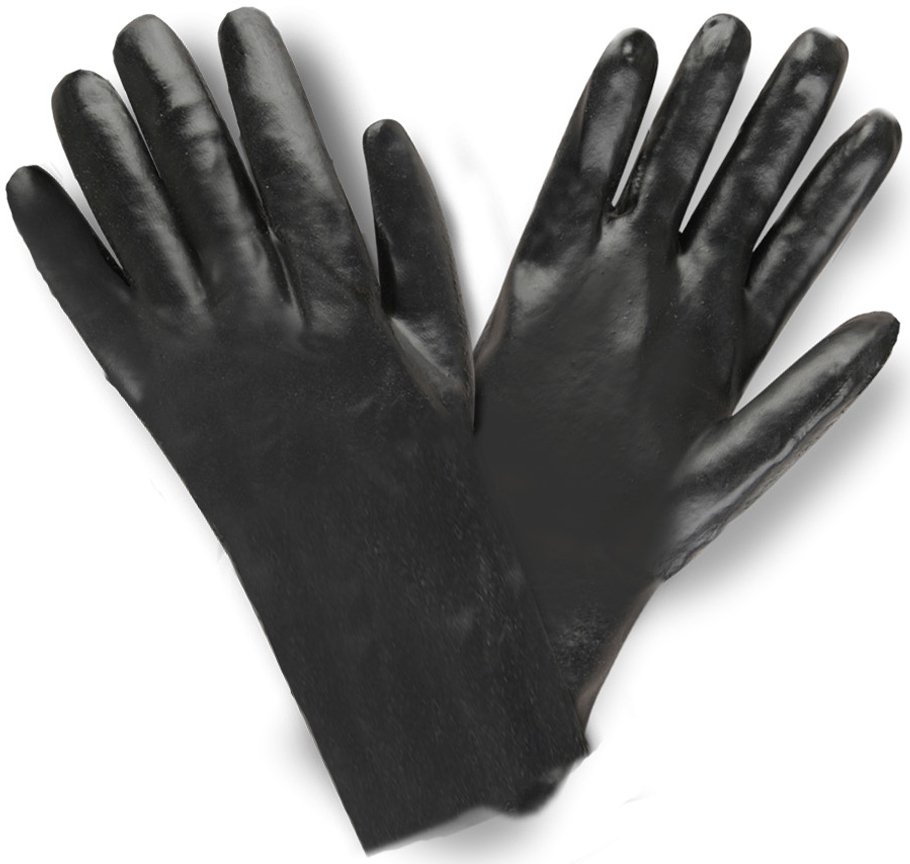 Polyvinyl alcohol-coated chemical-resistant gloves help resist strong organic solvents such as aromatics and chlorinates - the types which quickly deteriorate rubber, neoprene and PVC-coated gloves. Interlock knit lining. 12" and 14" fully coated gauntlet.Caution: Do not use gloves in water or water-based solutions.