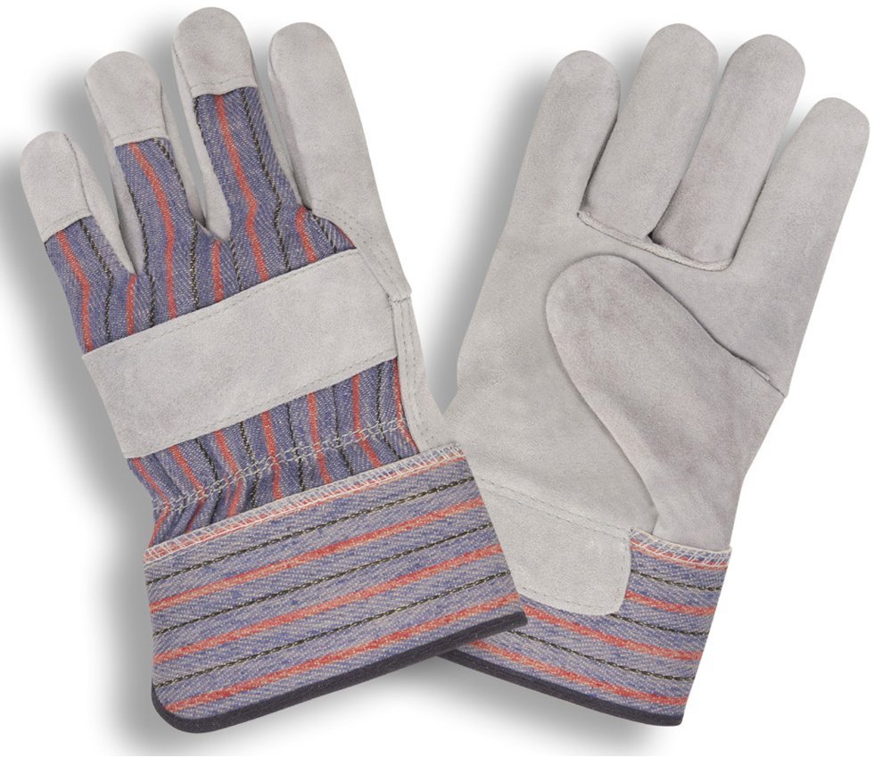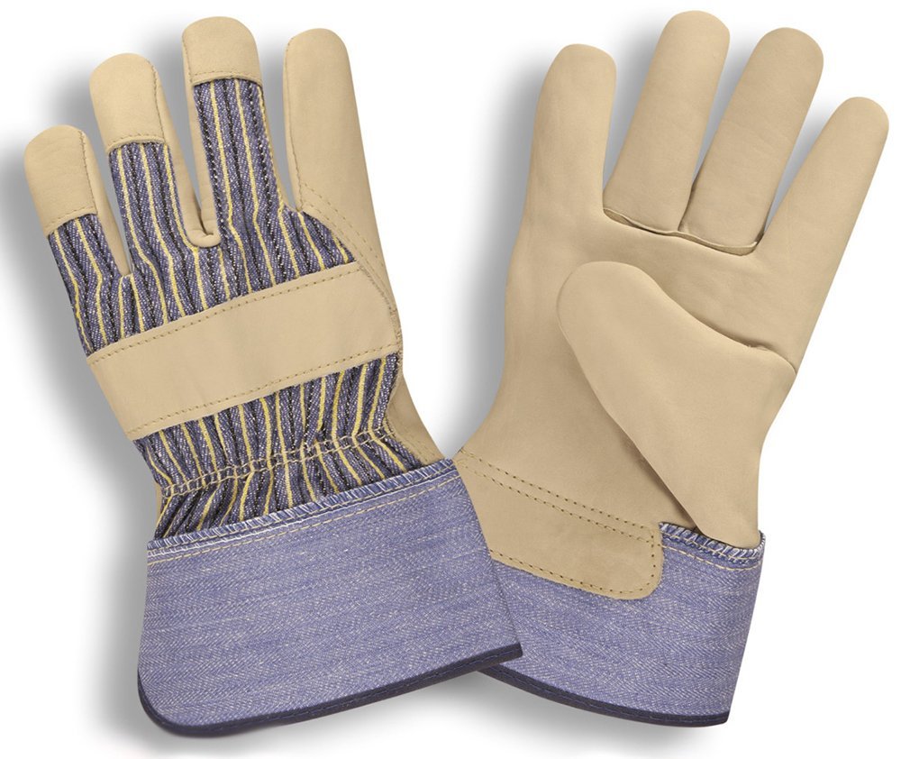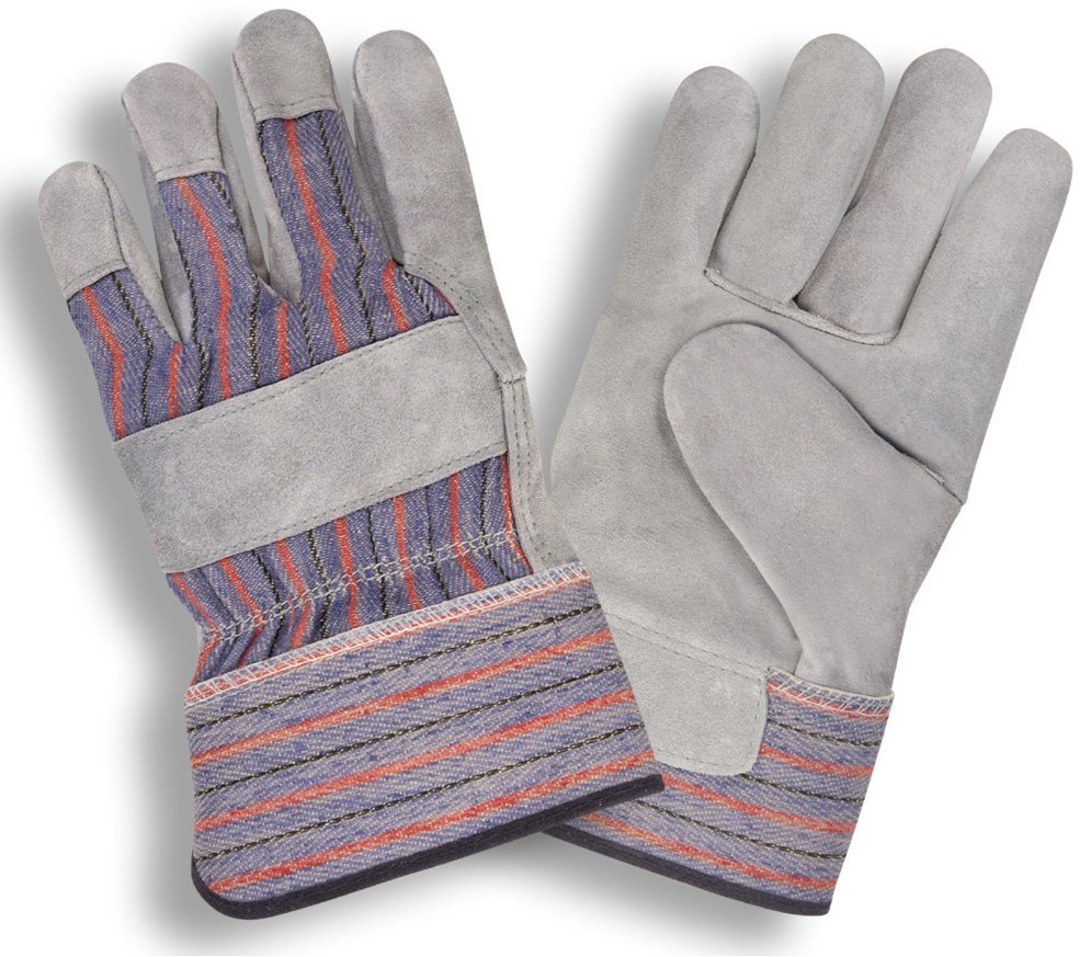 Economical split cowhide leather palm gloves feature starched safety cuffs for extended forearm protection. Blue denim fabric back, gunn cut pattern, and leather knuckle strap.