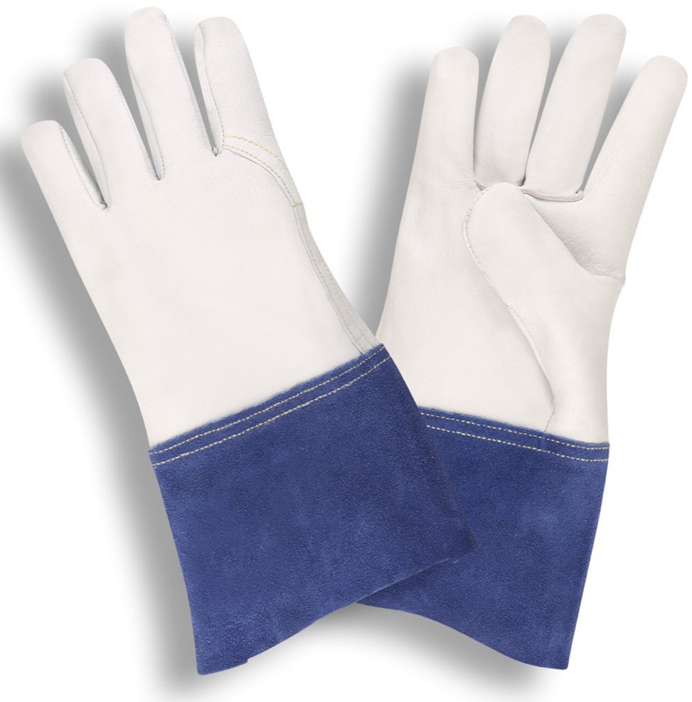 These premium grain goatskin MIG/TIG welding gloves are Kevlar® sewn and feature a wing thumb and blue split leather gauntlet cuff for protection.