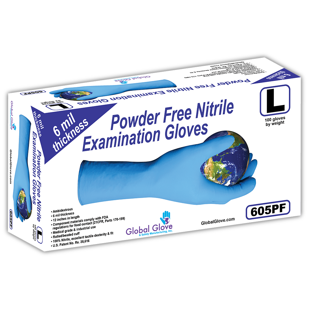 These gloves are made of 6 mil blue powder-free nitrile. They are medical grade, disposable, ambidextrous, 12 inches length, and feature a rolled/beaded cuff. They come 100 gloves to a dispenser box, 10 dispenser boxes per case. These gloves comply with FDA regulations for food contact.