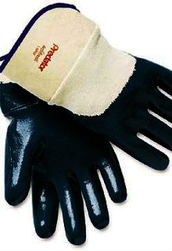 This nitrile-palm Predator® glove resists oil, grease and solvents. It offers excellent durability and flexibility for most industrial and material-handling applications. Soft jersey lining provides outstanding comfort, even in cold temperatures. Safety cuff. Men's universal size.