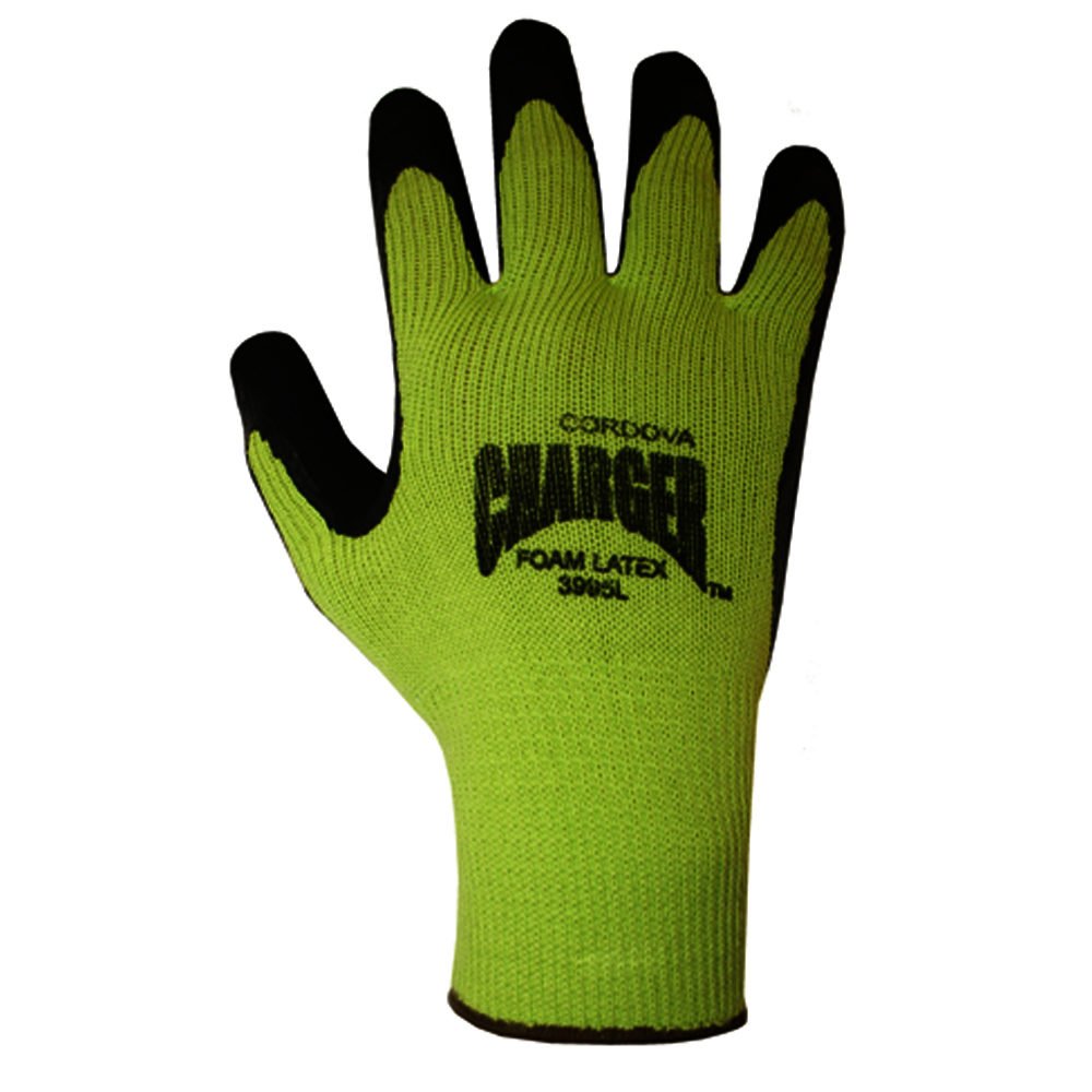 The Charger palm coated gloves feature a high visibility green polyester/cotton shell with a black foam latex palm coating. 10-Gauge. Sold by the dozen