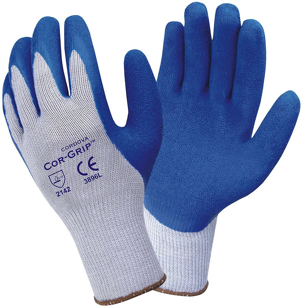 The Cordova 3896 Cor-Grip gloves feature a gray polyester/cotton shell with a blue crinkle finish latex palm coating. Sold by the pair