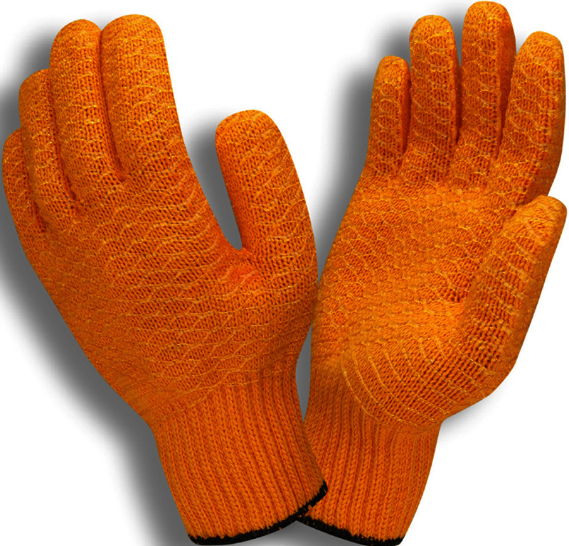 These polyester/nylon/acrylic knit gloves feature a two sided PVC pattern. The 7-Gauge gloves are orange and sold by the dozen.
