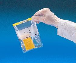 Use this transparent polyethylene bag for sampling and product analysis. Tape at the top of the bag extends over wire ends, eliminating sharp points that may cause bag puncture or damage to gloves and skin. Pull tabs help prevent contamination from finger contact when opening. Bags are available with and without a write-on area that accepts ballpoint pen or pencil. Thickness: 2.25 to 4mil.