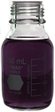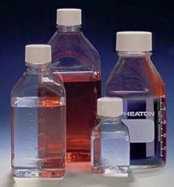 Wheaton® "400" Borosilicate Glass (meets USP Type 1 standards) has low alkali content to help prevent changes in pH and maintain purity of contents. When fitted with the rubber-lined cap, this bottle is widely used for mixing and storage of culture media. With the LDPE-lined cap, it is suitable for distilled water, analytical standards and reagents. The Teflon®-lined cap, available with the graduated bottles, is inert to most chemicals.