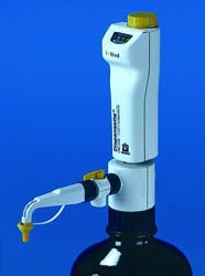 Dispensette® dispensers are rugged, reliable tools for the lab, for use with a wide variety of bases, concentrated and fuming acids (except HF), polar solvents, halogenated hydrocarbons, and most HPLC and combinatorial chemistry solvents. Floating piston design ensures smooth operation and reduces replacement of wearing parts. Unique SafetyPrime valve system enhances reagent conservation and dispensing safety, reducing splashes during priming. Valve block rotates 360° to allow the bottle label to face the user during dispensing. Unique one-twist discharge safety cap is easy to attach and remove. Telescopic filling tubes (from 125mm to 240mm) adjust easily to different size bottles, without measuring and cutting. All models are supplied with 45mm threads, and adapters for use with smaller bottles. Models up to 10mL nominal volume come with 24, 28, 33, and 38mm adapters. Larger models come with 28, 33, and 38mm adapters.