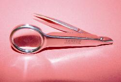 For very fine work, 4 long (102mm) integrated fine-point forceps with attached magnifying glass (5x - magnification).