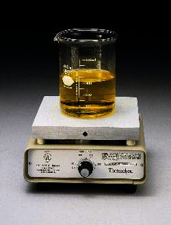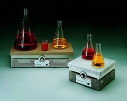 Advanced microprocessor controls with convenient turn knobs allow quick, precise adjustment and maintenance of temperature. The safety indicator LED on the front panel indicates when heating is activated. The 7.5" square work surface is compatible with popular sizes of borosilicate glass beakers, flasks, bottles and other vessels.