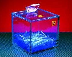 An opening in the lid of the Tip and Tube Beta Storage Box allows for the safe and easy depositing of used pipette tips and tubes. The container features nonskid feet for added safety and easy-to-read radiation warning labels. The compact box measures 6H x 6L x 6"W (15 x 15 x 15cm).