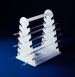 The PoxygridŽ Microliter Pipettor Rack has two rows designed to hold most popular brands of pipettors, and provides a convenient, easy-to-reach storage space. The rack has 10 spaces for pipettors and two large round holes which both accommodate a Drummond Pipette-AidŽ pipette filler.