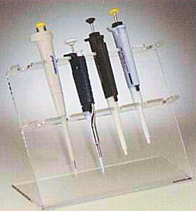 Benchtop pipettor storage is made easy with the Pipettor Stand-6 Rack. Up to six pipettors are stored on this angled clear acrylic holder.