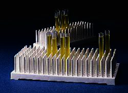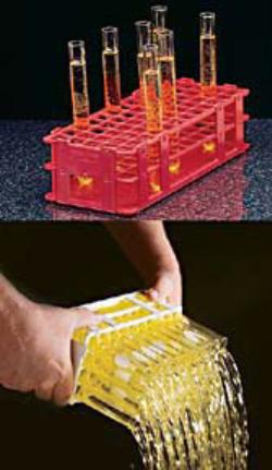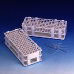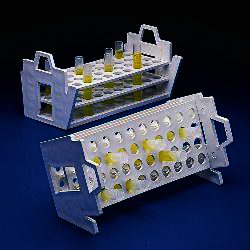 The Full-View Test Tube Support is extremely versatile. The rack utilizes narrow pins which can be used as a support for full tubes or in the draining process of empty tubes (inverted tubes fit easily over the pins). Steam autoclavable at 250°F (121°C). Several sizes and tube capacities available.