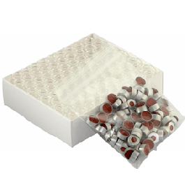 Bulk packed vials come in two bags of 250. The tray-packed vials are packed in five cardboard trays of 100 vials each (10 x 10).