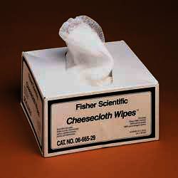 Cheesecloth Wipes absorb six times their own weight of solvents and aqueous solutions. The eight-ply Wipes meet laboratory requirements for cleanliness, softness, strength and absorbency, and they are ideal for cleaning delicate glassware, microscopes, pipettes, syringes and pH electrodes. Cheesecloth Wipes are inert to harsh solvents and are ideal for use as a filtering material. Reagent-grade quality and purity. Grade 10