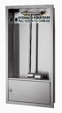 The stainless steel Cabinet-Mounted Station fits unobtrusively flush with a wall. The flow begins immediately when the swing arm is pulled down 90°, opening the 1/2ť IPS stay-open valve. The unit has chrome-plated brass pipes and fittings. It is designed to mount between standard 16ť wall studs and utilizes a 1/2ť IPS water supply.Eyewash Stations feature soft-flow eyewash heads with protective covers and a flow control which ensures steady water supply between 30psi and 90psi.Eye/Face Wash Stations have large perforated sprayheads which bathe the eyes and the face. The slightly largerBarrier-Free models are designed to comply with all ADA (Americans with Disabilities Act) guidelines regarding reaches, clearances and operating procedures. All models meet ANSI Z358.1-2004 standards.