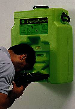 Station includes: Eyesaline® solution and an emergency eyewash sign. Constructed of tough, FDA approved, high impact polyethylene. Lockable fill-top cap reduces risk of tampering.