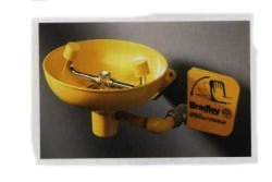 The wall-mounted Eyewash or Eye/Face Wash features a 12" bowl with anodized aluminum wall bracket. Assembly has two fine-spray heads with "flip-top" dust covers and chrome-plated brass supply arm. Activated by a 12" IPS chrome-plated stay-open ball valve with a cast aluminum flag handle. Fully factory assembled and water tested. Unit meets ANSI Z358.1 standard (comes with ANSI compliant identification sign).