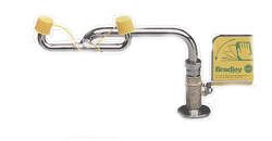 Pull knob to activate and angle forward. Water pressure keeps eye wash going for hands-free use. Complete with float-off dust covers. The outlet heads and valve are chrome-plated brass.