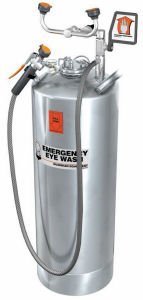 Take emergency eyewash equipment right to job site. Stainless steel tank has built in carrying handles, air intake fitting, pressure gauge, and automatic pressure relief valve. TheEyewash assembly has two gentle-spray heads with flip-top dust covers and chrome-plated brass supply arm. Activated by a 1/2" IPS chrome-plated brass stay-open ball valve with a cast aluminum flag handle. The 6', reinforced PVCDrench Hose is activated by a chrome-plated squeeze valve. Includes a 8 ounce bottle of bacteriostatic additive. Meets ANSI Z358.1 standard.