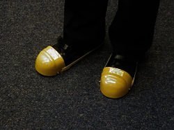 Fits easily over street shoes by simply placing the strap firmly around the back of the heel. For use when steel toe footwear is not necessary, but added protection is needed. Molded plastic construction is ideal for temporary employees and visitors.Toe Caps protect the front of the foot. Available in either a Men's or Women's size. Or try theMetatarsal Guard. It protects the entire top of the foot and is a universal design to fit all sizes.