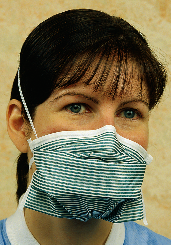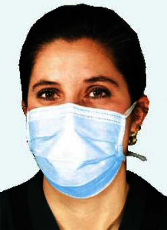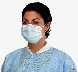 This health care particulate respirator and surgical mask helps provide respiratory protection against certain airborne biological particles. It is disposable and fluid resistant to splash and spatter of blood and other infectious material.
