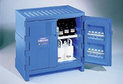 Store acids and corrosives safely and optimize your work area with these 100% polyethylene, nonmetallic Acid Storage Cabinets. They have a smooth finish for easy cleaning, integral handles with locking tabs, and drip edges to keep spills in the cabinet. Also include two 2 polyethylene vents with vent covers, and a large Acid Warning Label on each door.