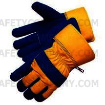 These waterproof pile-lined gloves provide warmth in cold weather applications. Great for cold storage, outdoor baggage handling and outdoor maintenance work. Featuring a blue leather palm with yellow back, knuckle and safety cuff.