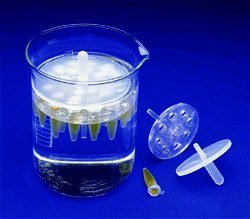 easily by pressing the rack down on a bench until the short legs touch. Fits either 1.5mL or 0.5mL tubes. Models with a hold-down pressure cap are designed specifically for incubation applications using 1.5mL tubes. The hold-down disk keeps continuous pressure on the tube caps and prevents them from opening due to internal air expansion. The rack floats and remains immersed at a constant level regardless of water level. Both Round Floating Bubble Rack styles are made of buoyant foam-filled TPX® (polymethylpentene) and are steam autoclavable at 250°F (121°C).