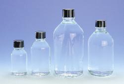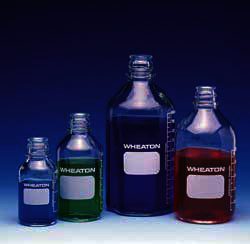 WheatonŽ "400" Borosilicate Glass (meets USP Type 1 standards) has low alkali content to help prevent changes in pH and maintain purity of contents. When fitted with the rubber-lined cap, this bottle is widely used for mixing and storage of culture media. With the LDPE-lined cap, it is suitable for distilled water, analytical standards and reagents. The TeflonŽ-lined cap, available with the graduated bottles, is inert to most chemicals.