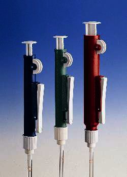 The Pipette Pump II delivers fast and efficient one-handed pipetting with glass or plastic pipettes. Light finger pressure easily inserts pipette into flexible thermoplastic rubber chuck. Stabilizing fingers hold pipette securely. Rotate the knurled thumb wheel to draw liquid to the desired volume. For gradual dispensing, rotate the thumb wheel. Light pressure to the fast release lever empties the pipette rapidly. Color-coded for size. Pipettes not included.