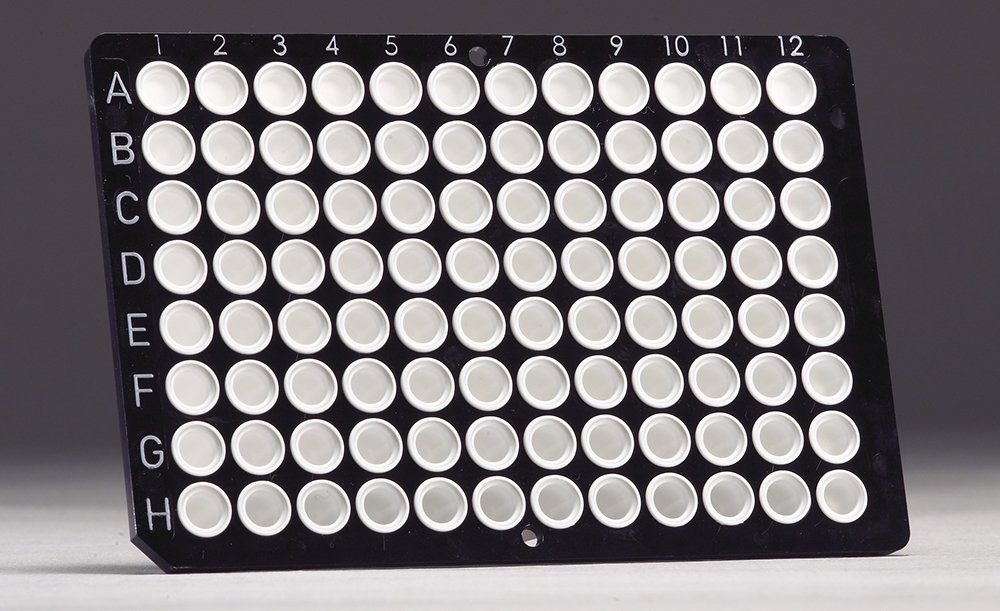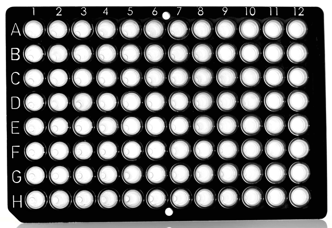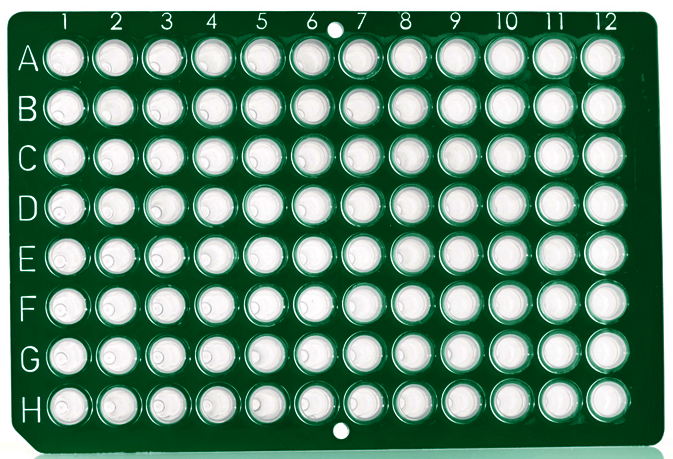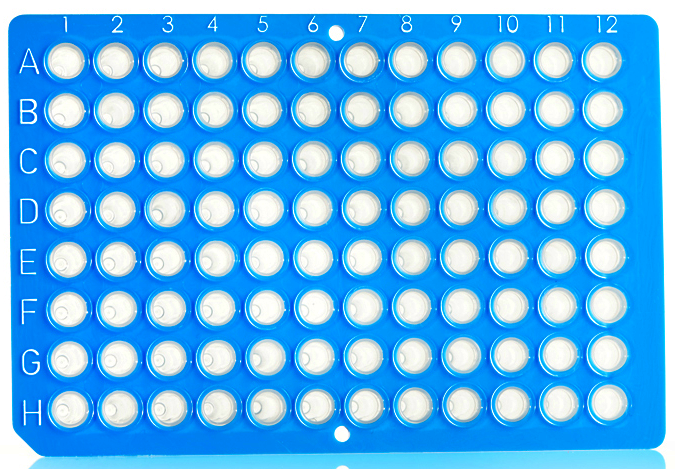 Universal fit to low profile 96-well blocks; with low profile 0.15 ml polypropylene wells, a rigid non-skirted polycarbonate frame, and a cut corner at H1