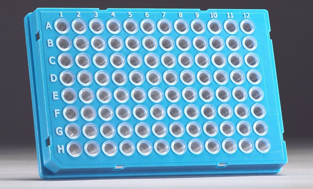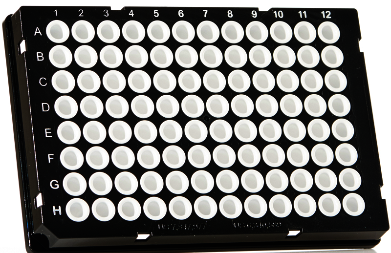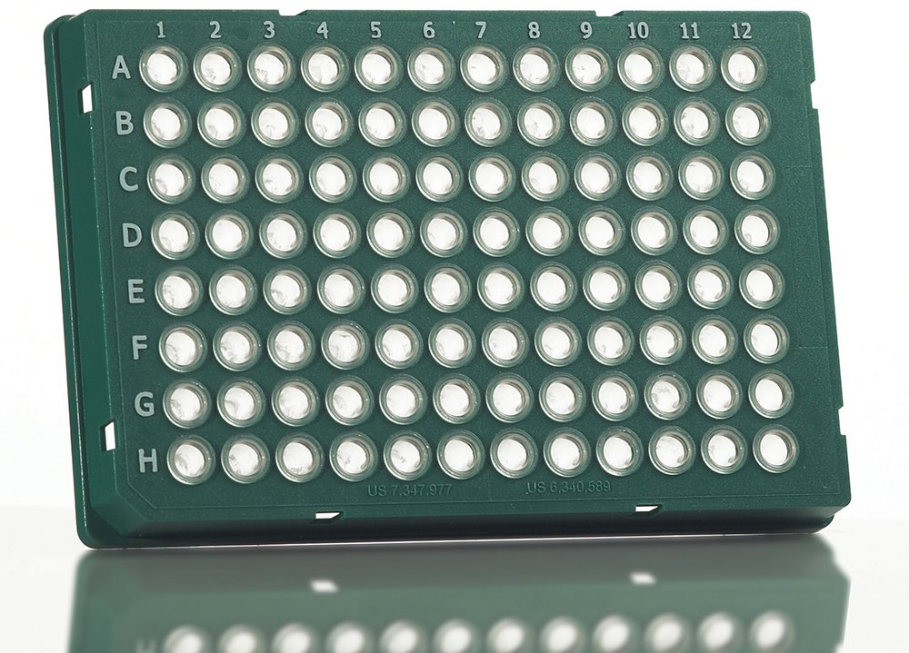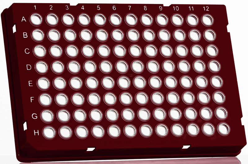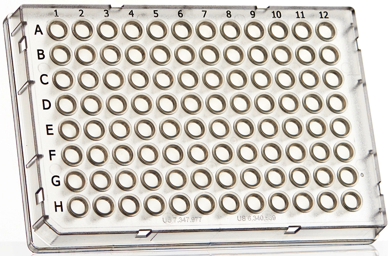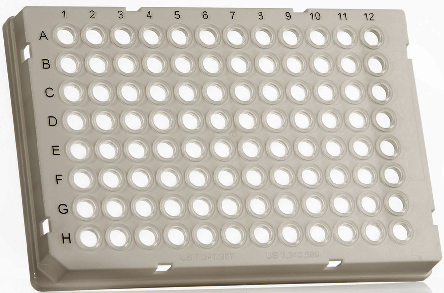 Features low profile 0.15 ml polypropylene wells, a rigid polycarbonate frame, and a cut corner at H1