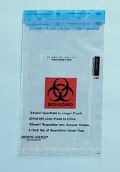 Disposable specimen bag features the patented liquid-tight Press and Close glue closure system. The one-touch safety seal virtually seals itself, without awkward and inconvenient glove-to-adhesive contact. A separate outside pocket holds the requisition slip. They are disposable, which eliminates the possible reuse of a contaminated bag. Each bag is printed with easy-to-read instructions and a biohazard logo.