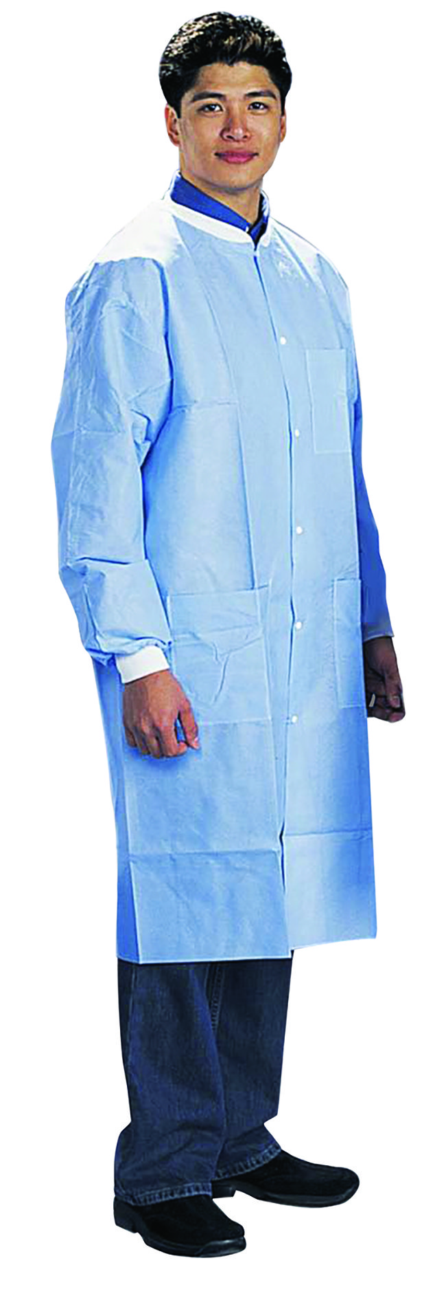 Offers low-cost protection from non-hazardous fluids, particles and dirt. This full cut Lab Coat gives below knee length protection and features comfortable white knit collar and knit wrists. With one breast pocket, two side pockets, and a five-snap front closure for easy on/off.