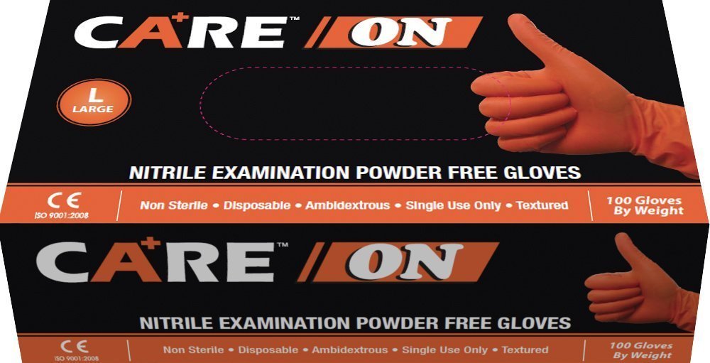 CARE ON Nitrile Gloves, Powder-Free, Textured, Orange, 100/Box, 10 Boxes/Case, TG Medical, ON500, Nitrile Powder-Free Length: 230mm min Thickness (Finger): 6 mil Thickenss (Palm): 5 mil Elongation at break (Before Aging): Mi