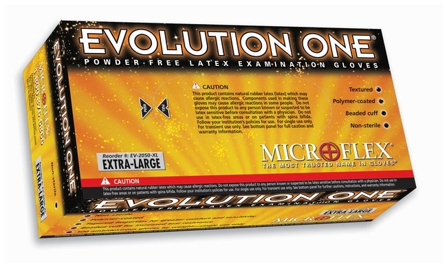 The Evolution One Latex Glove is the standard for exceptional comfort and premium quality in the laboratory setting. This polymer-coated glove is highly durable and goes on easily without powder. Longer and thicker than standard examination gloves for added barrier protection, and fully textured for better gripping in a variety of conditions. Ambidextrous. Evolution One meets or exceeds proposed FDA standards and current ASTM standards.