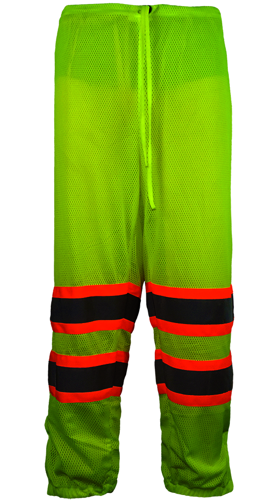 These Mesh Safety Pants are constructed of a lightweight mesh polyester featuring layered horizontal stripes on legs. A silver reflective material on a contrasting orange background. Handy inside and outside pockets.