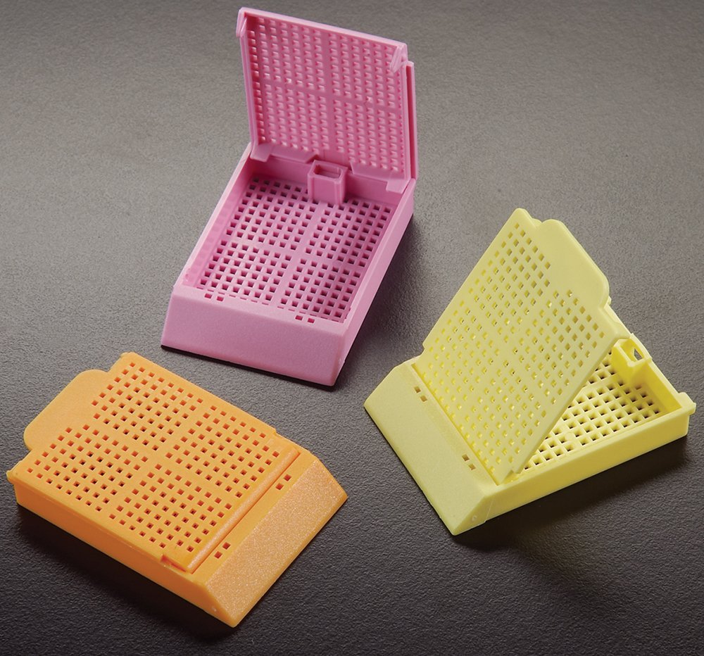 Biopsy Cassettes have perforated lids and bases, whileTissue Cassettes are slotted. The one-piece integral lid eliminates the need for separate steel lids. They can be opened and closed as often as necessary and will always relock securely without danger of specimen loss. Histosette® II Cassettes feature large labeling areas on three sides of the cassettes. The anterior writing area is slanted at a 45° angle to make the cassette more suitable to be used with certain types of cassette labeling instruments.