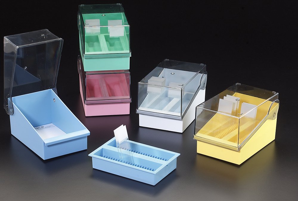 SlideFile Jr. is the same great system in a smaller size, with each box having 50 numbered slots and a total maximum capacity of 200 slides. Dimensions: 3-1/4 x 5-1/2 x 3-3/8H (82 x 140 x 86mm) and only 53 cu. in. (860cm3). Each SlideFile and SlideFile Jr. box comes with a white base. Other base colors are available. Contact customer service for ordering information. Two numbered index cards supplied with each box. SlideFile units are not autoclavable.