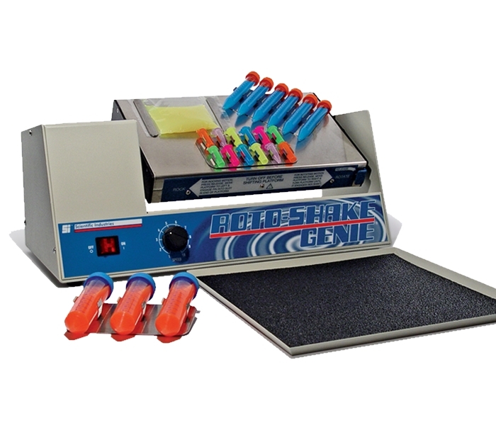 The Roto-Shake Genie® is a combination platform/tilt, shaker, rocker and specialized rotator that is able to mix tubes in different motions: rotating, rocking/shaking, rotating/rocking, rolling/rocking, or rotating/rolling. Or transform the unit into an orbital shaker with the optional 3-D Orbital Shaker attachment. The two-sided, easily removed 8 x 13.5¯ (20.3 x 34.3cm) stainless steel magnetic platform needs only a simple mechanical adjustment to convert from rotating to rocking or back again. Platform is magnetized to hold up to four metal clip plates per side, each holding same-sized or variably sized tubes for different mixing motions. Platform uses magnetic strips to accommodate up to two 6 x 6¯ (15.3 x 15.3cm) plastic bags per side, or a 12 x 12¯ (30.5 x 30.5cm) nonskid metal rocker tray for conventional rocker/shaker operations.
